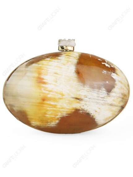 Handcrafted oval buffalo horn clutch featuring natural brown–ivory marbling, constructed on a 14k gold-tone electroplated brass frame with a sugarstone-style crystal knob clasp. Includes suede lining, secure clasp closure, and detachable chain strap for wholesale, OEM, and export supply.