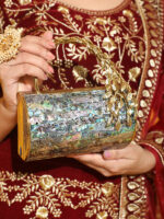 Handcrafted barrel-shaped hard-shell clutch featuring abalone mother-of-pearl mosaic inlay with natural iridescence, paired with a gold-tone brass frame and sculptural cascading leaf handle. Designed for wholesale, OEM, and export supply.