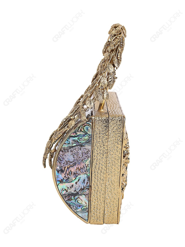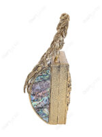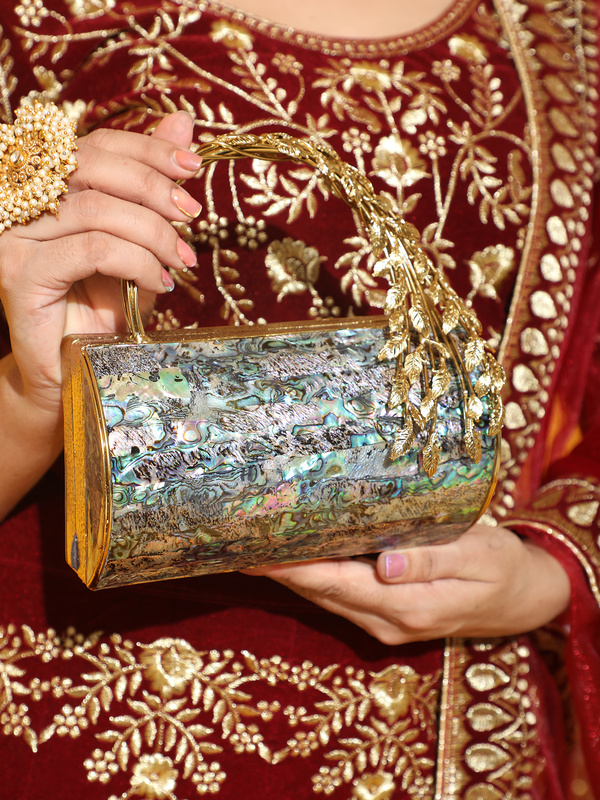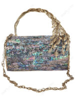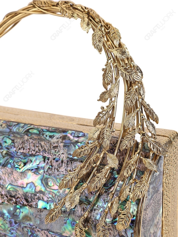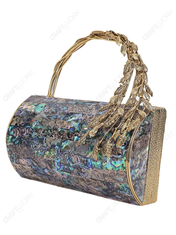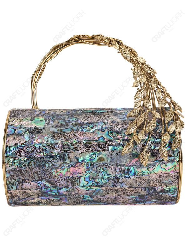 Abalone Mother-of-Pearl Mosaic Barrel Clutch with Sculptural Brass Leaf Handle | Wholesale & OEM