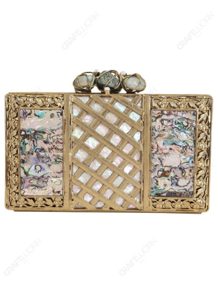 White MOP Rectangular Clutch: 14k Gold Electroplated Brass, Gemstone-Studded Arched Wirework Handle, Magnetic Closure, Bulk Supply