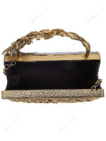 The top handle is intentionally engineered as the product’s main identifier. A multi-rod brass structure is combined with cascading leaf detailing on one side, creating a sculptural profile that photographs strongly and reads clearly on shelves, in catalogues, and in curated eventwear assortments.