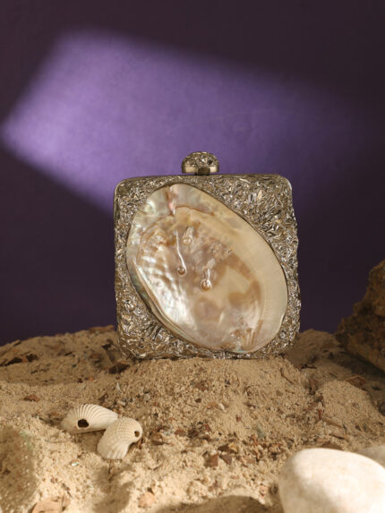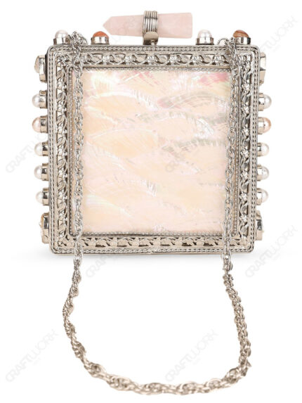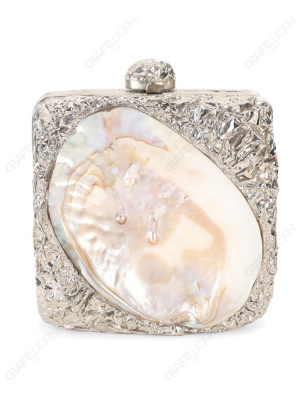 Inside-Out Mother-of-Pearl Shell Clutch, Silver Electroplated Brass, Crumpled Texture Square Hard Case, Metal Knob Clasp, Wholesale Supply