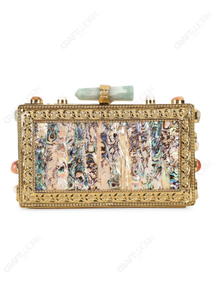 Abalone MOP Rectangle Clutch: 14k Gold Electroplated Floral Frame, Gemstone & Pearl Side Settings, Bulk Orders