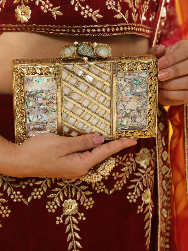 This rectangular hard-shell clutch is developed for buyers sourcing structured occasion accessories where material value and surface detailing must be immediately visible at merchandising distance. The front layout balances bold abalone iridescence with controlled brass architecture, creating a high-impact SKU suited to premium boutique assortments and export programs.