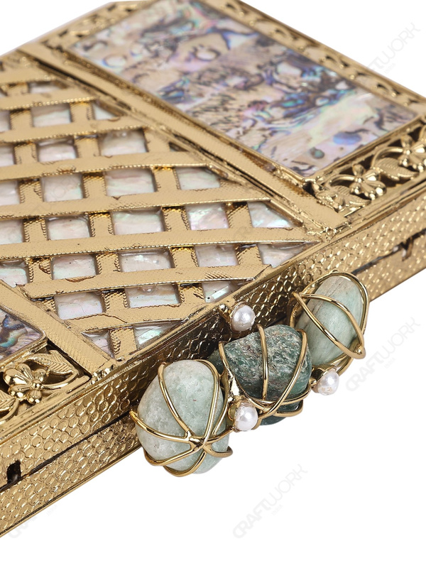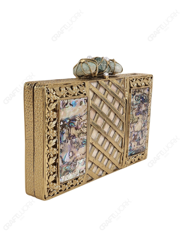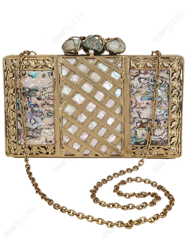 Abalone Mother-of-Pearl Evening Clutch with Brass Lattice Panel & Stone Trio Knob | Wholesale & OEM