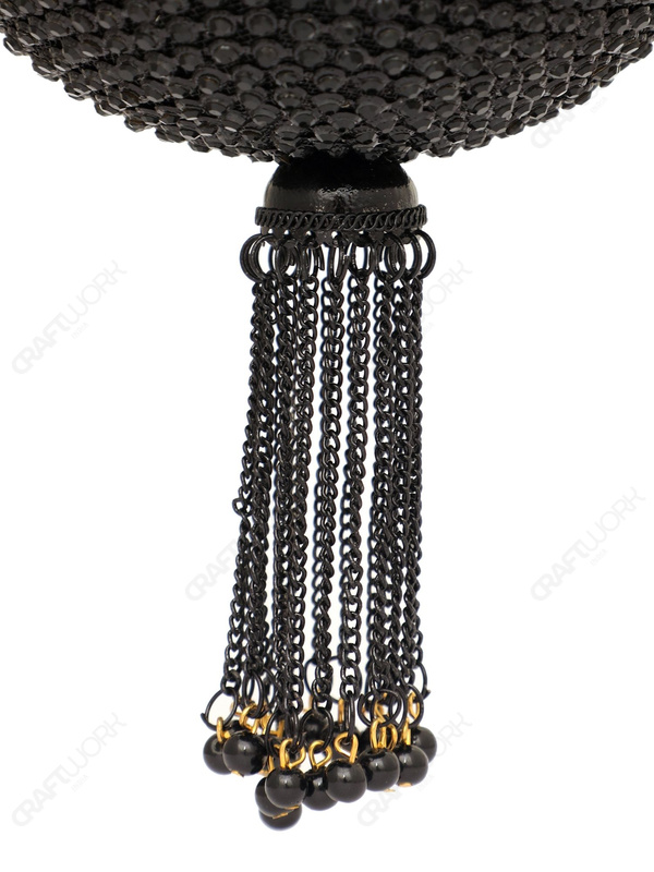 2000 hand-placed black crystals and beads adorn the metalwork. A black tassel with black beads accents the base |