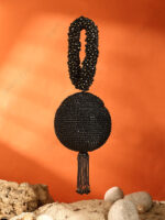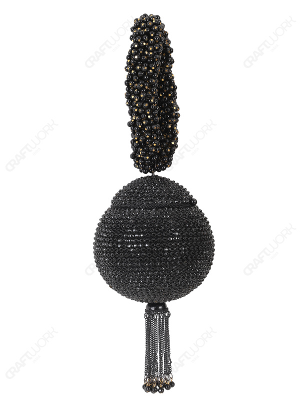 A handcrafted black crystal ball evening clutch featuring approximately 2,000 hand-set crystals, a beaded wrist handle, and tassel detailing. Designed for bridal, eveningwear, and luxury gifting collections, suitable for wholesale, OEM, and private label supply.