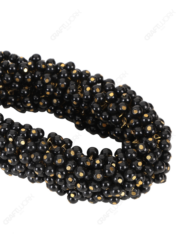 Beaded wrist handle crafted from black beads threaded onto gold-toned metal pins |