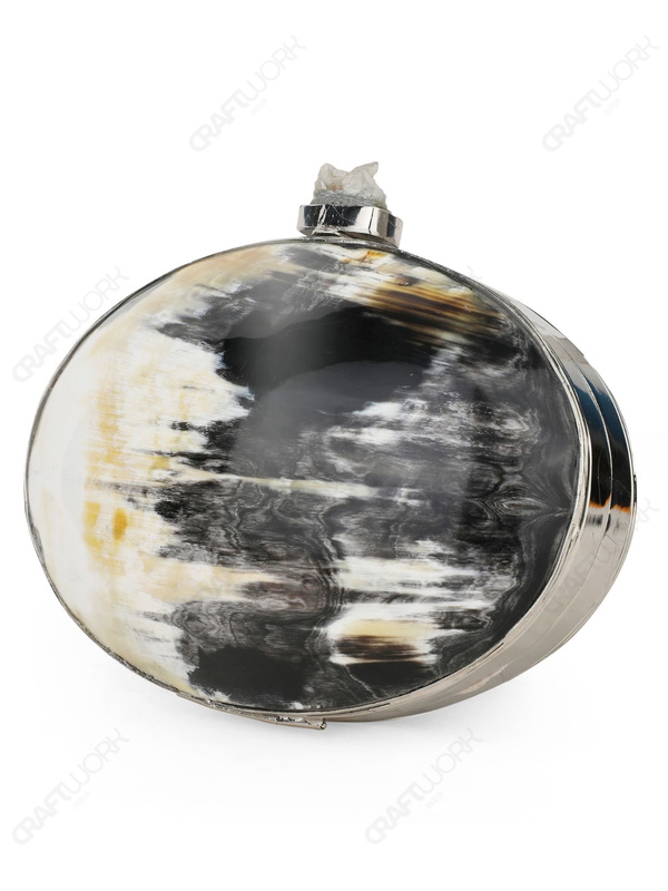 This handcrafted horn clutch is developed for wholesalers, retailers, and sourcing teams looking for premium natural-material accessories for boutique and export programs. The oval hard-shell format highlights authentic buffalo horn marbling in black, ivory, and warm amber tones, finished on a silver-tone electroplated brass frame with a sugarstone-style clasp knob.