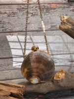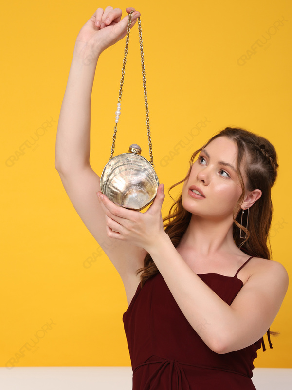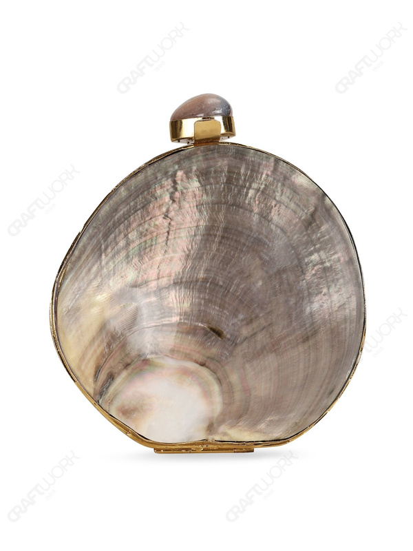 This round shell minaudière is designed for buyers building high-impact, low-competition accessory assortments using authentic natural materials. The exterior presents the signature pearlescent depth of black-lip oyster shell, framed in a polished gold-tone finish to support elevated retail positioning and consistent visual merchandising.