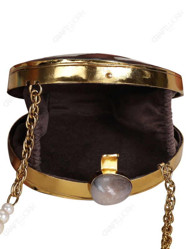 Handcrafted round minaudière using genuine black-lip oyster shell on a gold-tone electroplated brass frame, finished with a natural gemstone cabochon clasp and detachable chain strap. Built for premium boutique assortments, private label programs, and export-ready wholesale supply.