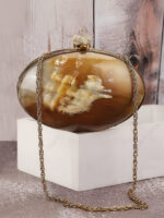 Handcrafted oval buffalo horn clutch featuring natural brown–ivory marbling, constructed on a 14k gold-tone electroplated brass frame with a sugarstone-style crystal knob clasp. Includes suede lining, secure clasp closure, and detachable chain strap for wholesale, OEM, and export supply.