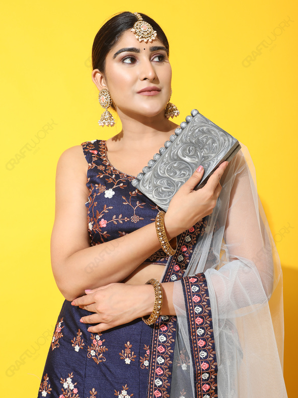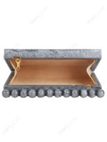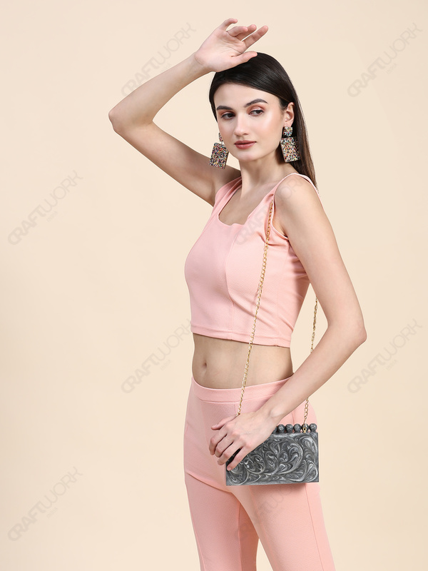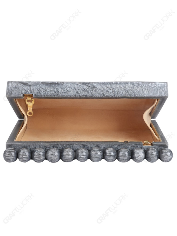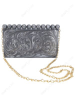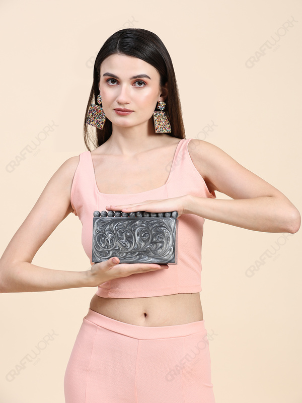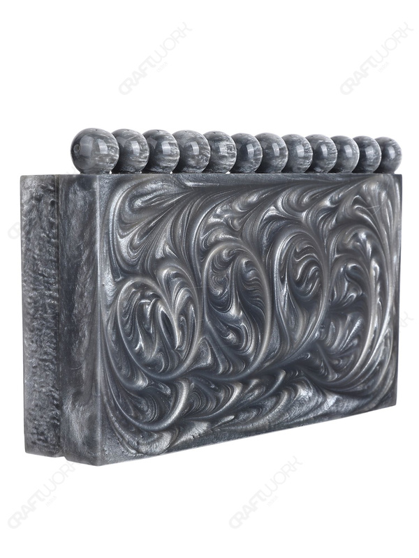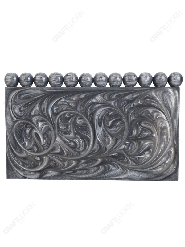 This handcrafted resin clutch is designed for buyers who need compact, structured silhouettes with immediate visual differentiation at display distance. The grey swirl surface creates a fluid, marble-like movement under light, while the top bead detail functions as a recognizable design signature that helps the style stand out in curated boutique and occasion-focused collections.