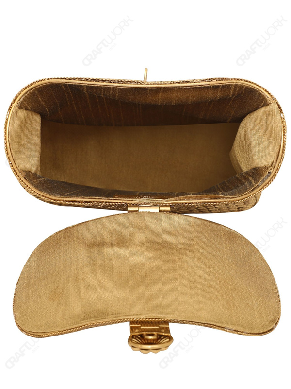 This Gold Crystal Filigree Bridal Clutch is developed for wholesalers, retailers, and fashion brands sourcing premium bridal and occasion accessories for domestic and export markets. The design features an all-over crystal-detailed gold-tone exterior, a crystal clasp closure, and a pearl-beaded top handle for a structured hand-carry format.