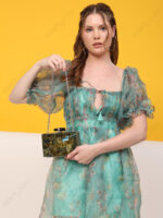 Gold Glitter Mini Square Resin Clutch with Beaded Top Handle & Detachable Chain Strap | Wholesale / OEM / Export