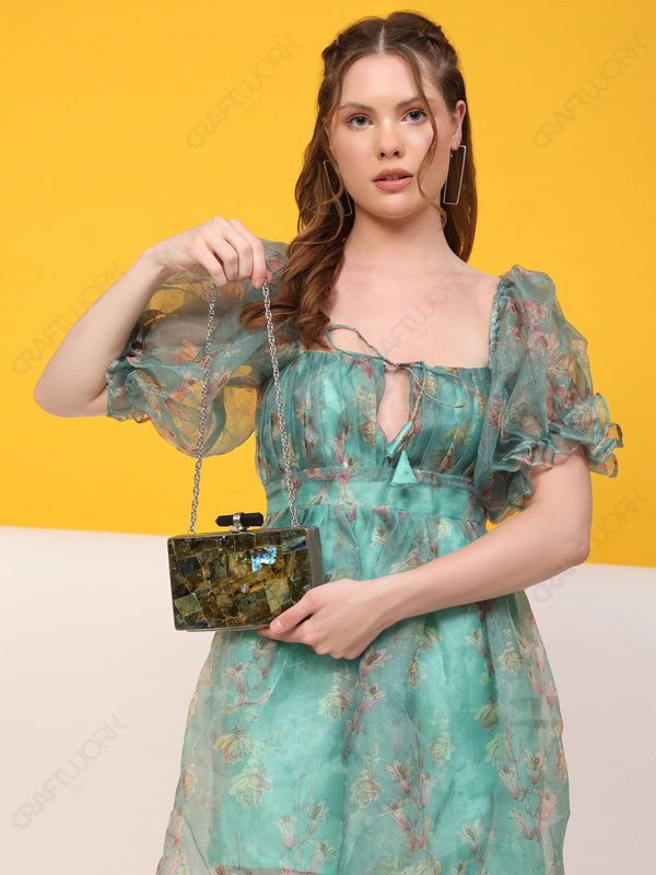 This labradorite clutch is developed for buyers sourcing material-led, premium hard-case accessories with high visual impact and repeatable production standards. The rectangular form factor supports clean merchandising and consistent catalog presentation across bridal, occasionwear, and curated boutique categories.