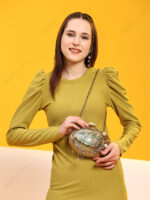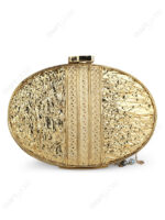 The metal frame functions as both a visual border and a load-bearing structure. Its textured treatment enhances grip and impact resistance while visually framing the shell surface. This construction approach ensures the clutch maintains rigidity, alignment, and closure integrity during shipping, retail handling, and end use.