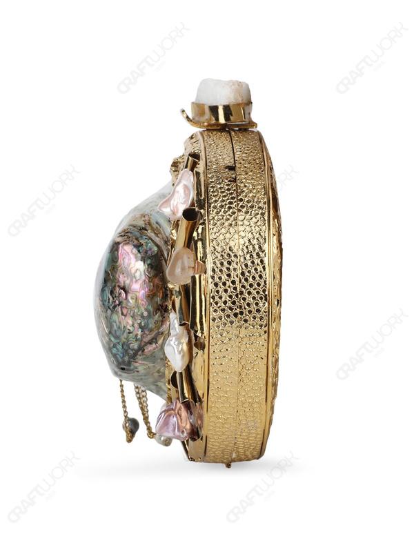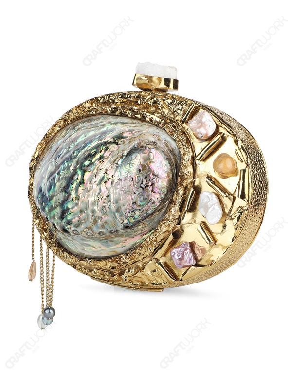 Hard-case clutch developed around a natural paua abalone shell, structurally set within a gold-plated brass frame and finished with gemstone and mother-of-pearl embellishments. Designed for international wholesale, private label, and export-focused accessory programs requiring distinctive handcrafted value.