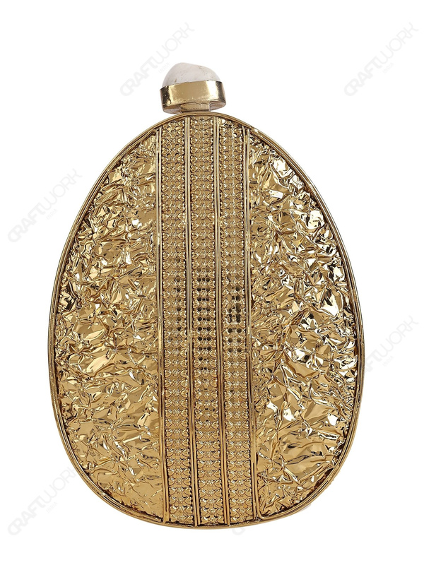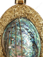 The front is built around an iridescent abalone shell centerpiece, selected for its naturally shifting multi-tone surface. A bold, textured gold-finish surround creates a high-contrast frame that reads clearly in merchandising, photography, and in-hand presentation.