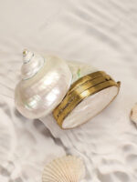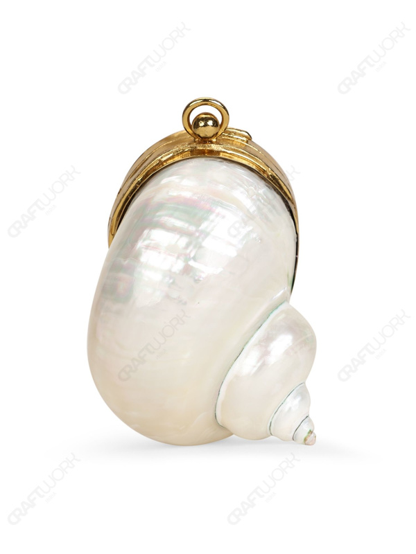 A compact hard-shell turbo seashell coin purse developed for premium add-on accessory programs and export supply. The shell opening is converted into a secured compartment through a fitted gold-tone electroplated brass frame, finished with a push-lock brass knob closure and a clean top presentation suitable for curated retail assortments.