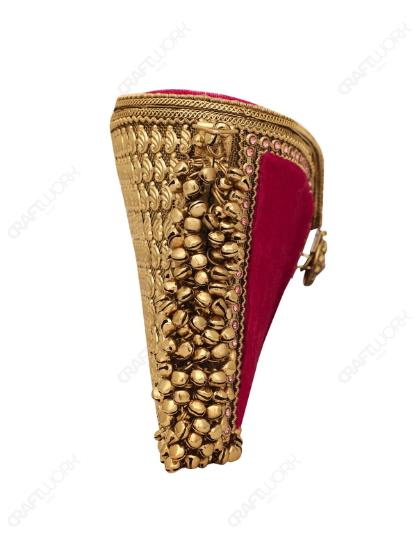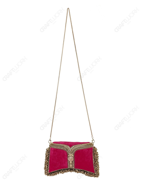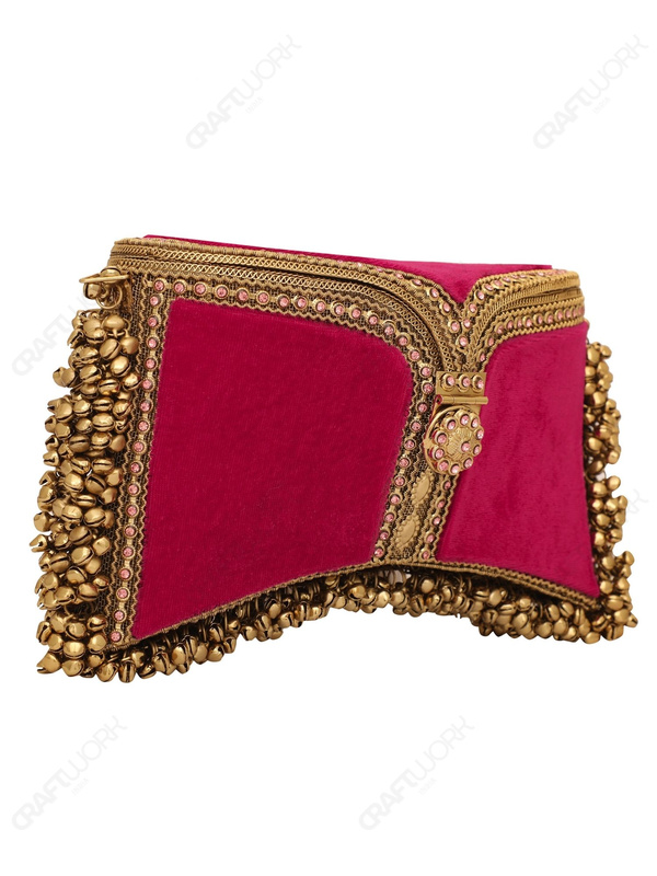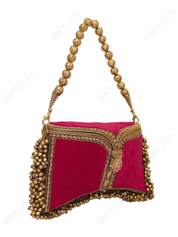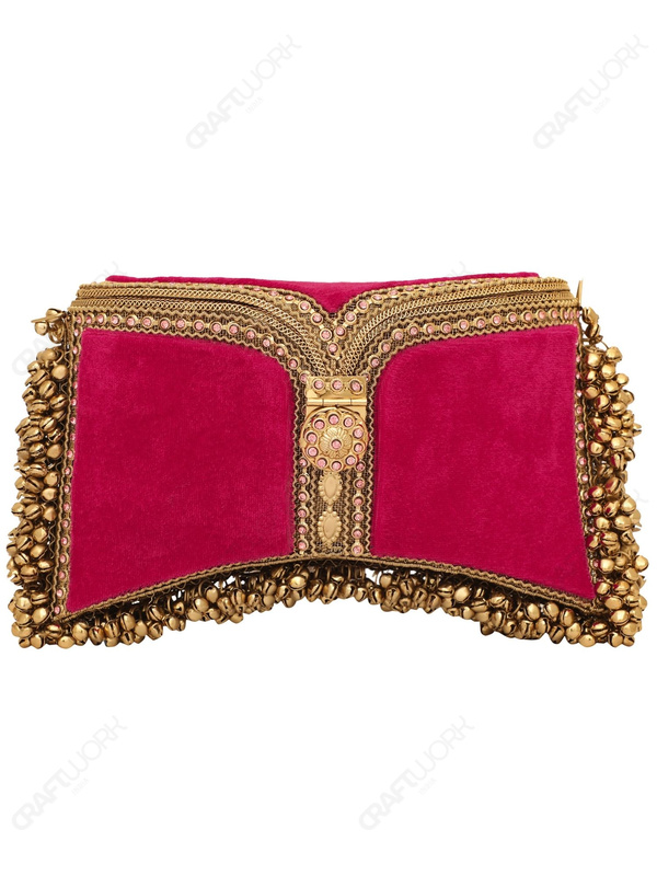 A handcrafted red and gold bridal/occasion clutch featuring crystal-embedded filigree metalwork, rich red velvet panels, and hand-threaded bell fringe detailing. Developed for bridal and premium occasionwear collections with consistent production standards, available for wholesale, OEM, and bulk export supply.