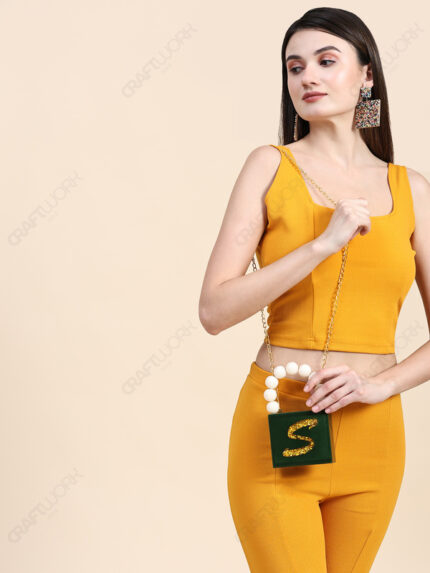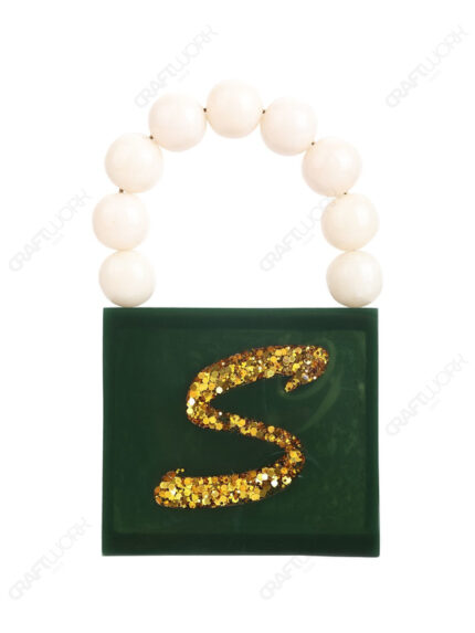 Gold Glitter Mini Square Resin Clutch with Beaded Top Handle & Detachable Chain Strap | Wholesale / OEM / Export