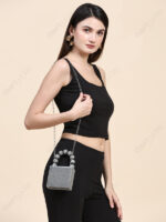 This mini square hard-case clutch is designed for wholesale buyers who need compact silhouettes with strong shelf visibility and clean merchandising. The silver glitter finish delivers high sparkle under retail lighting, while the structured format supports predictable shape retention during display and customer handling.