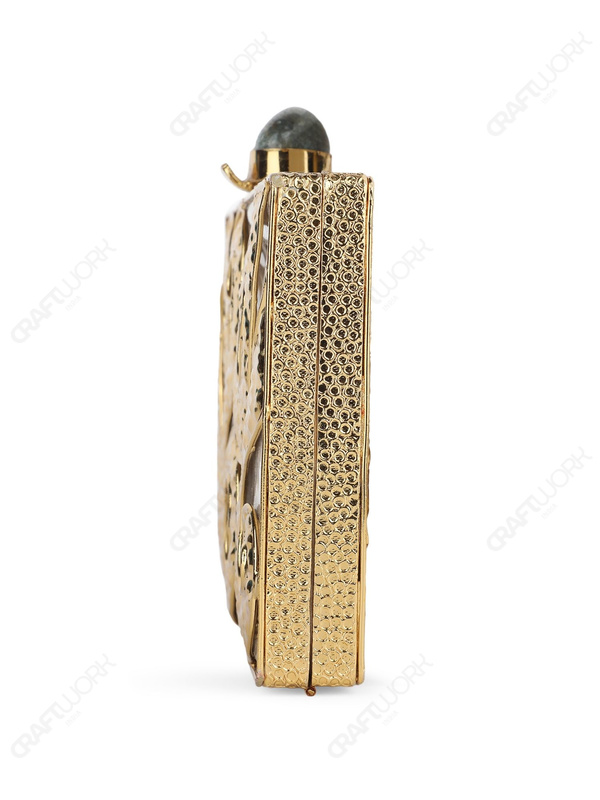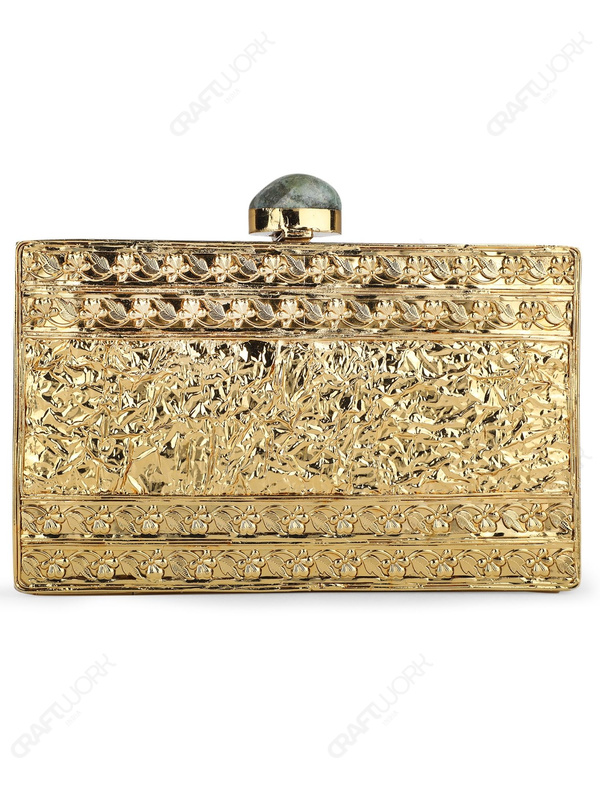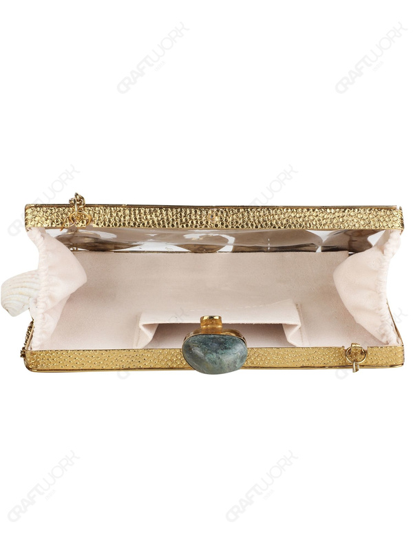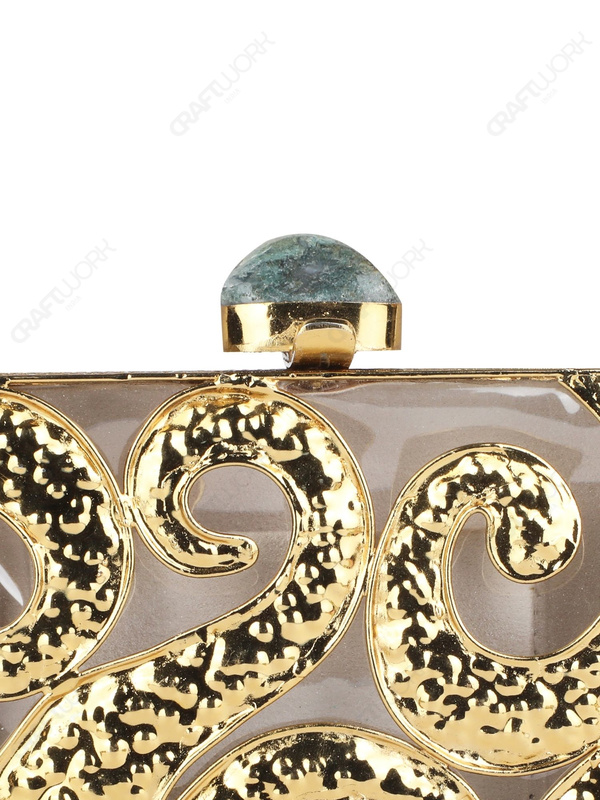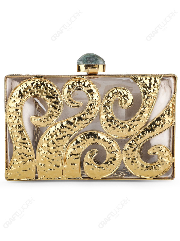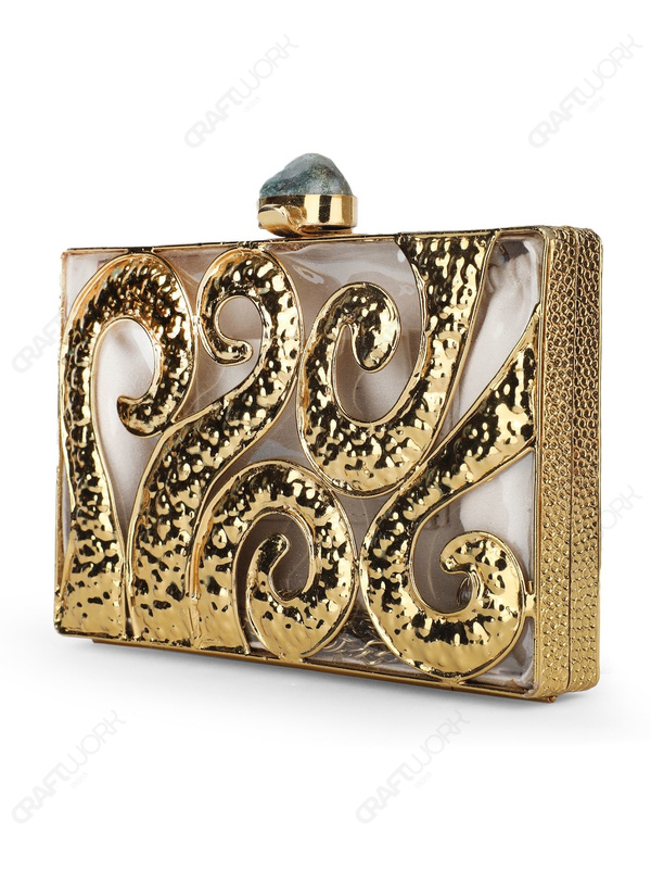 Transparent Gold Metal Minaudière with Hammered Swirl Overlay & Natural Stone Clasp | Wholesale OEM Export