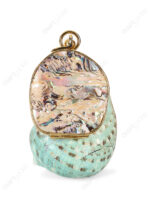 The brass frame is perfectly fitted to the shell's natural opening ,transforming it into a closed compartment with mother of pearl inlaid on the top |