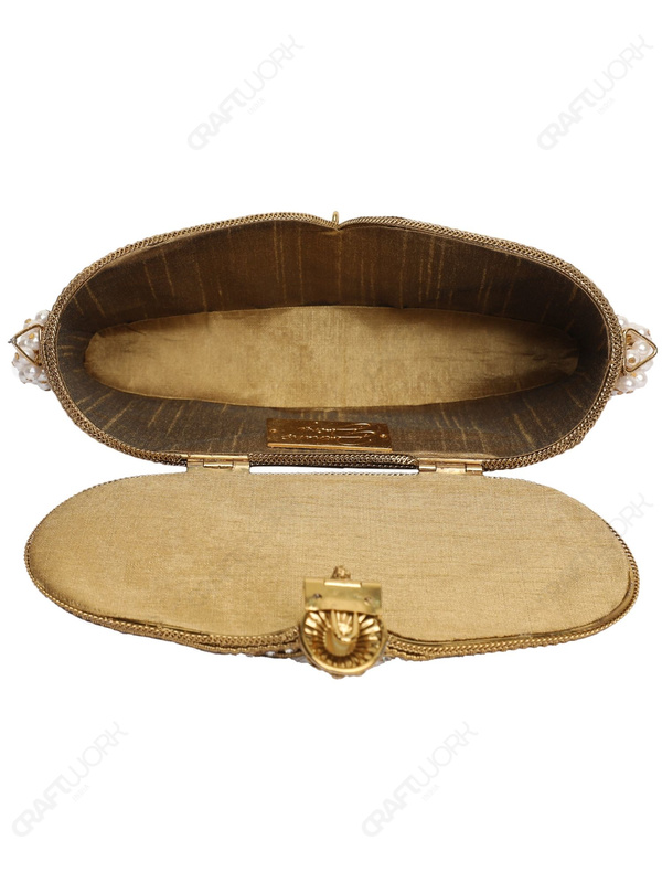 White & Gold Crystal Filigree Bridal Clutch – Pearl Beaded Handle | Wholesale & OEM Supply