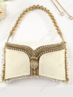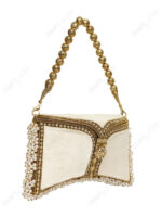This White & Gold Crystal Filigree Bridal Clutch is developed for wholesalers, retailers, and fashion brands sourcing premium bridal and ceremonial accessories for domestic and international markets. The design combines gold-tone filigree metalwork, soft white velvet panels, and pearl embellishments to meet the aesthetic and quality expectations of wedding and formalwear collections.