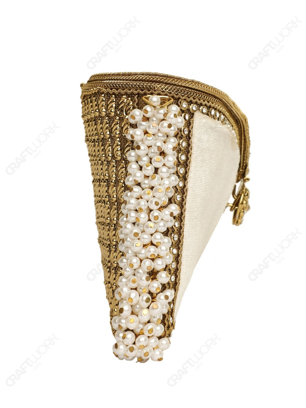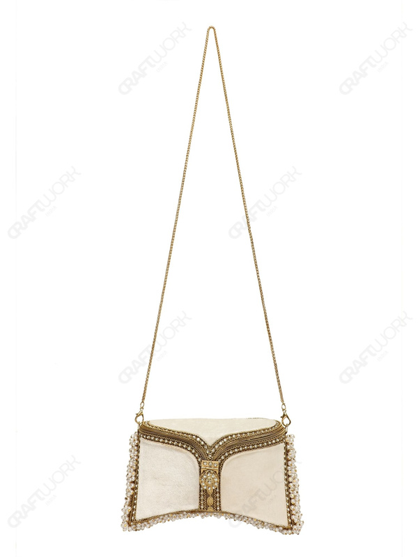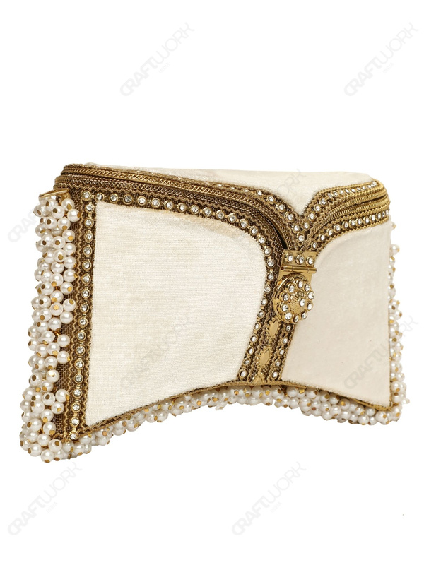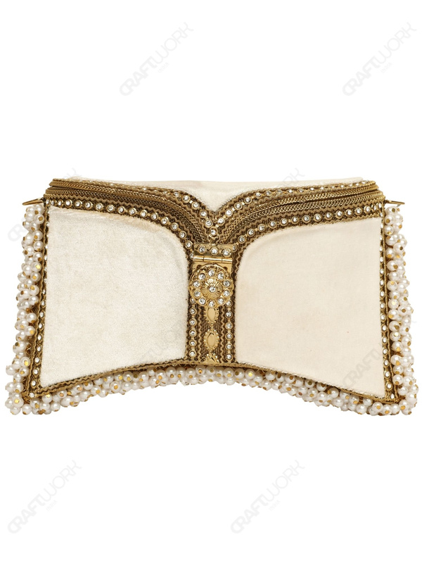 A handcrafted white and gold bridal clutch featuring crystal-embedded filigree metalwork, white velvet panels, and hand-threaded pearls. Designed for bridal, ceremonial, and premium occasion collections with consistent production standards, and available for wholesale, OEM, and bulk export supply.