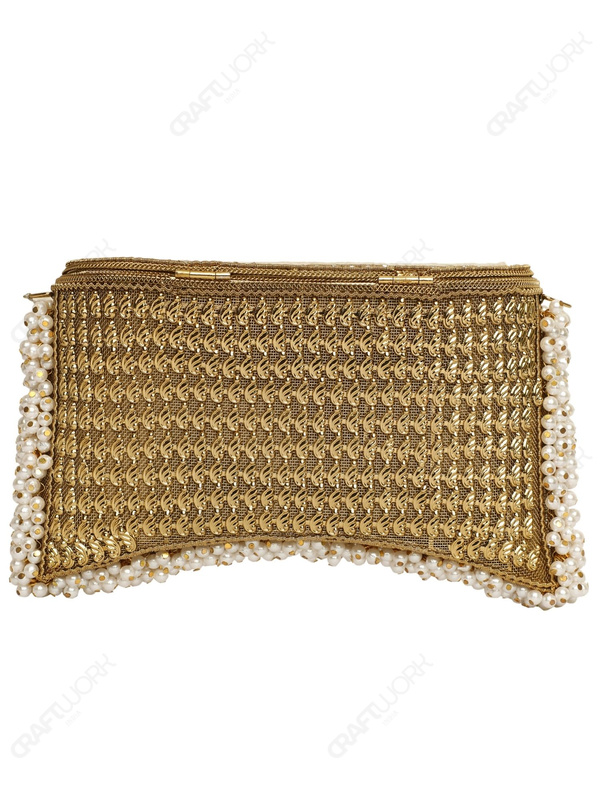 The clutch is crafted on a rigid metal frame with a secure clasp-lock closure. It includes a detachable short gold-tone beaded handle for hand-carry and a detachable long metallic chain strap for shoulder or crossbody wear. The interior is lined with a smooth silk fabric and features a single compartment designed for evening essentials.