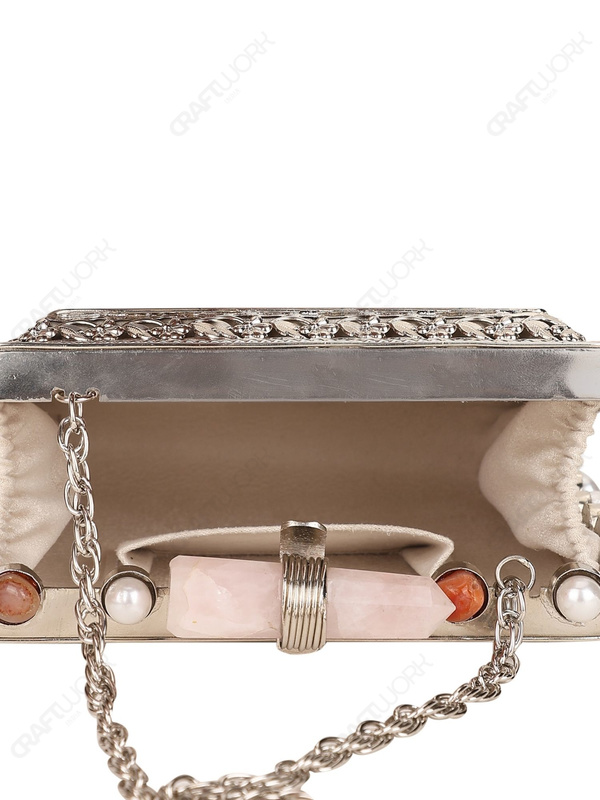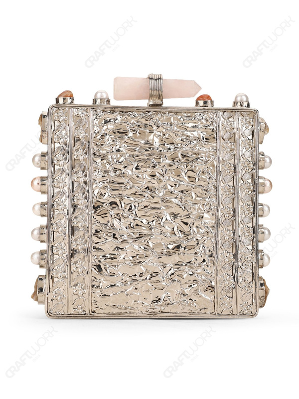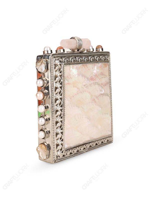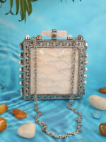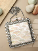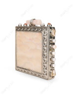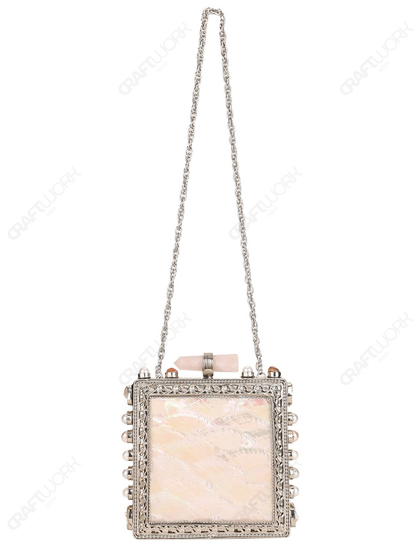 Square hard-shell Mother of Pearl clutch constructed on a silver electroplated brass frame, featuring a large inlaid white MOP front panel framed by an ornate floral metal border. Side frame includes round settings fitted with pearl and natural stone accents. Finished with an elongated quartz crystal bar knob clasp, smooth suede lining with internal pocket, and a detachable silver-tone chain strap. Developed for wholesale, private label, and export supply.