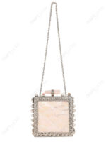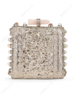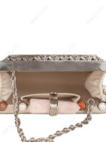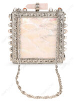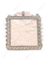 This square hard-case clutch is developed for premium wholesale programs where clean surface value and visible metalwork detailing are required in a structured format. The design is centered on a white mother-of-pearl face panel, paired with an ornate floral border that defines the product’s front identity for curated assortments.