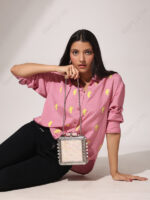 The white MOP surface is selected for controlled iridescence that photographs consistently and supports repeat merchandising across collections. The floral border creates a formal perimeter and keeps the silhouette disciplined, allowing buyers to place the style into boutique and occasionwear lines without additional design adaptation.