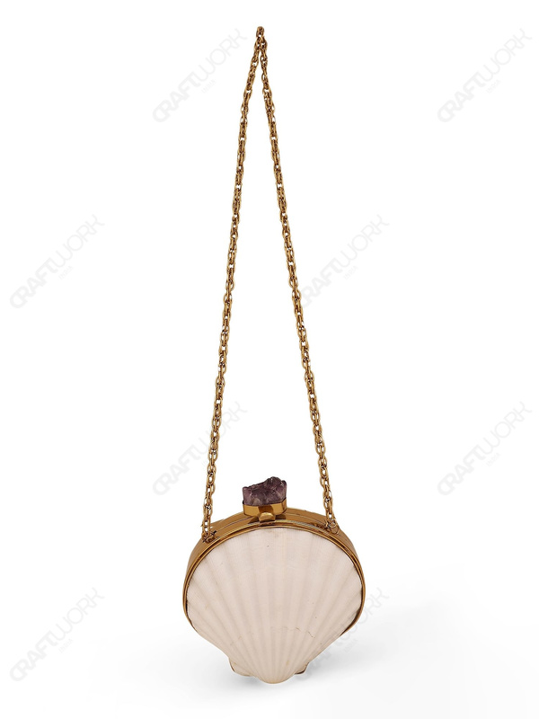 A compact hard-shell scallop minaudière developed for premium retail assortments and export supply. Built around a double-sided natural scallop shell body, structured with a gold-tone electroplated brass frame and finished with a raw amethyst cluster clasp for distinctive merchandising and repeat-order programs.