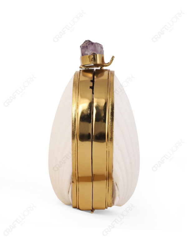 Mini White Scallop Shell Purse with 14k Gold Electroplated Brass Frame & Raw Amethyst Cluster Clasp – Wholesale & Export